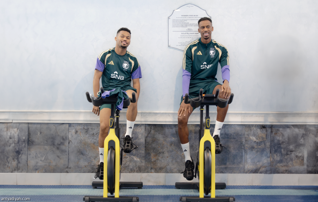 محمد كنو، لاعب وسط المنتخب السعودي، وزميله أيمن يحيى، يتدربان بالدراجة الرياضية الثابتة داخل النادي الصحّي، السبت، غداة الفوز على جزر القمر في كأس العرب (المركز الإعلامي ـ المنتخب السعودي)